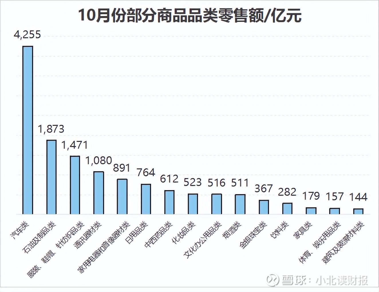 今年10月份,汽车类的零售额=日用品类+中西药品类+化妆品类+文化办公用品类+烟酒类+金银珠宝类+饮料类+家具类+体育、娱乐用品类+建筑及装潢材料类的和,还要多。