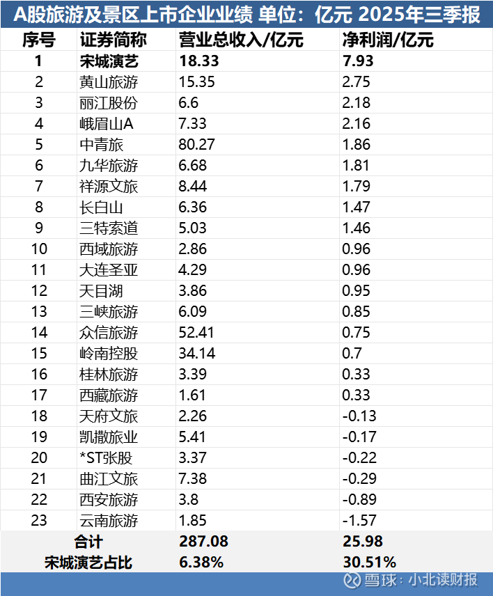 如下表所示,今年前三季度宋城演艺实现营收18.33亿元,实现净利润7.93亿元,净利润大约是第二名黄山旅游的3倍。