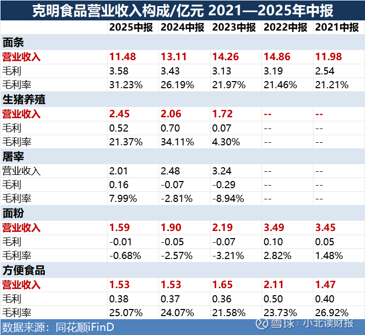 如下表所示,克明食品面条业务的营收自2023年开始下降,2025年上半年营收为11.48亿元,低于2021年的11.98亿元。