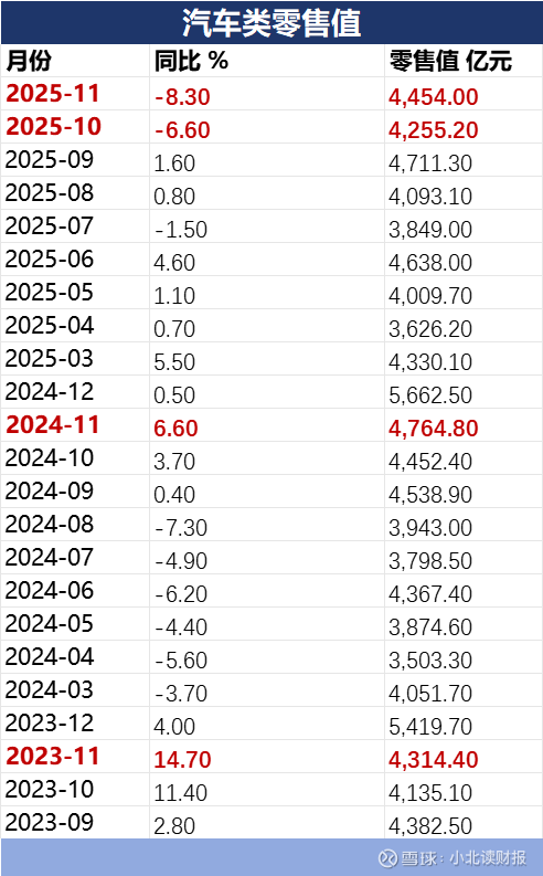 除了家电,汽车零售额也出现了自10月份起同比下降的现象。