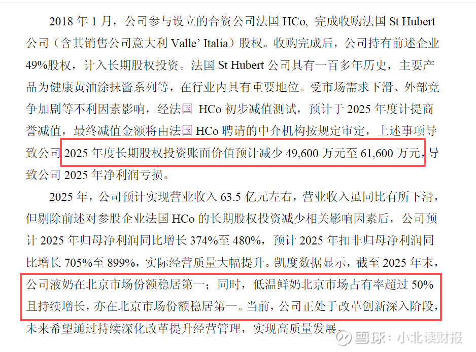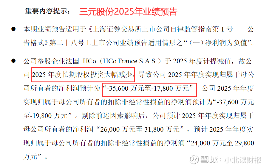 三元股份法国合资公司收购的公司业绩不佳,使得三元股份长期股权投资减少4.96—6.16亿元,进而导致2025年公司业绩亏损。