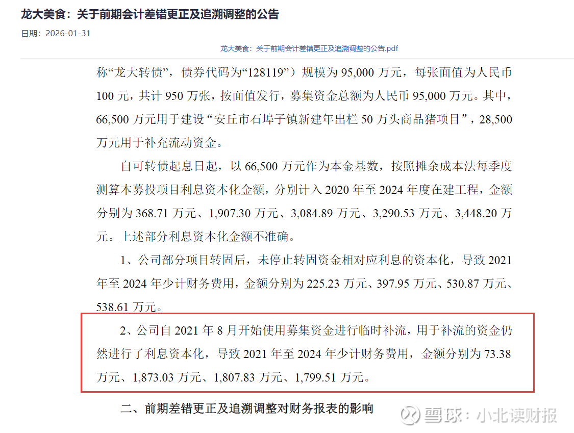 原本以为利息费用资本化处理只是存在于教科书上的理论化的虚增利润的方式,没想到龙大美食竟然提供了鲜活的样本,而且还是在2026年1月30号公之于众的。