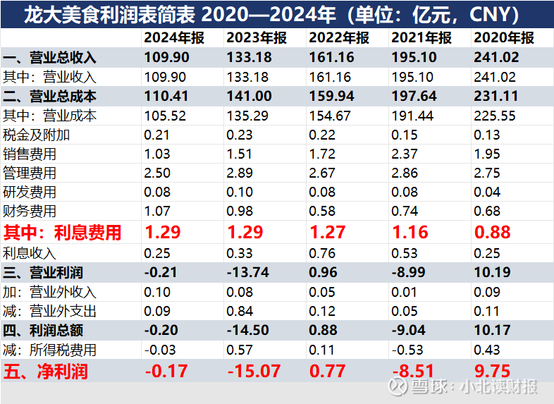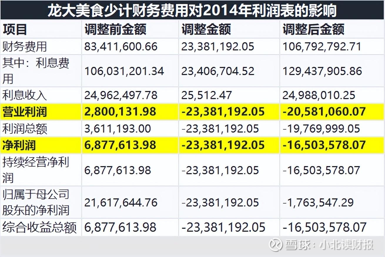 龙大美食少计的利息看似金额不大,实际上是在隐瞒公司亏损的现实,下图是公司追溯调整以后的财务数据。
