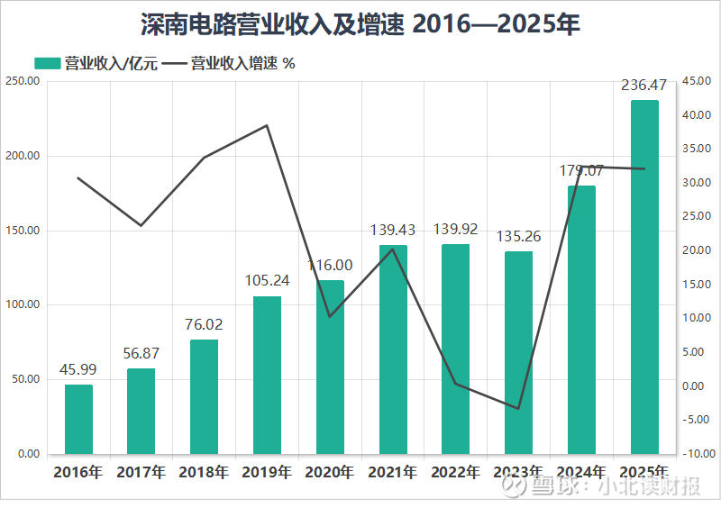 与行业增长同步,深南电路2024年营收179亿(同比+32.39%),2025年营收236亿(同比+32.05%)。