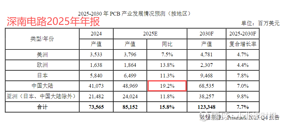根据公司年报披露的数据,2025年以美元计价的全球PCB产业产值为852亿美元,同比增长15.8%;从区域分布看,未来五年全球各区域PCB产业仍呈增长态势,其中,中国大陆地区复合增长率为7.0%。