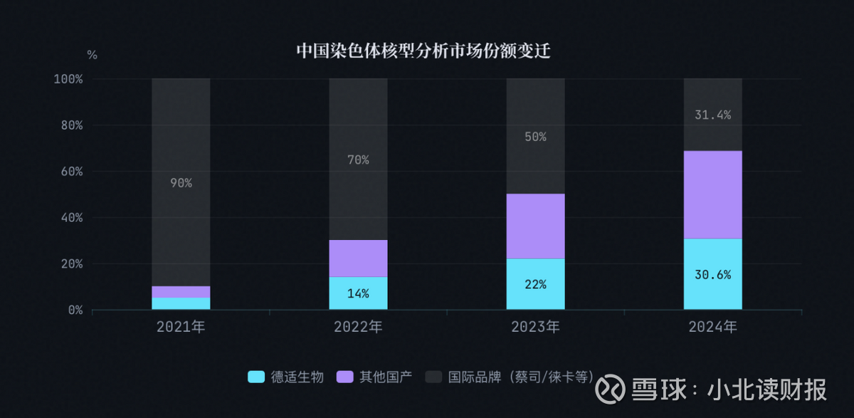 染色体核型分析市场长期被卡尔蔡司、徕卡等国际巨头垄断,两者曾占据90%以上份额,设备售价高达千万元级别。德适2024年市占率30.6%,全国第一,超越所有国际品牌;产品进入400多家医疗机构,覆盖31个省市;中国排名前十的医院采用率40%(协和、中山医院等)。