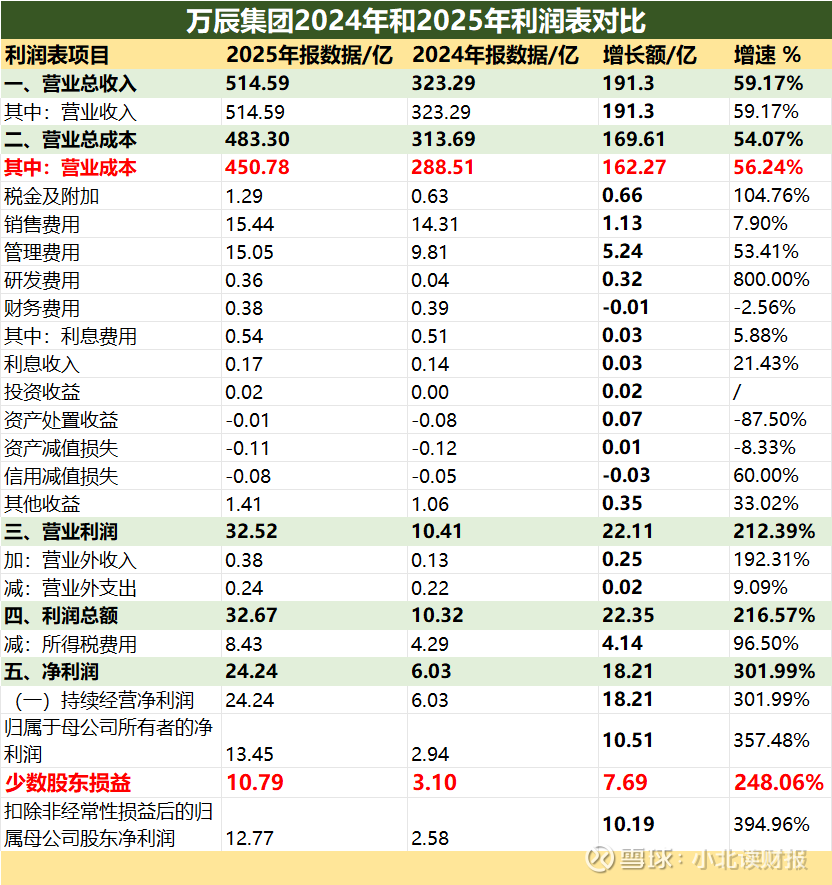 再看万辰集团的利润表,会发现它2025年净利润翻了3倍,原因跟海天味业、伊利股份等公司的净利润增长,根本不一样。