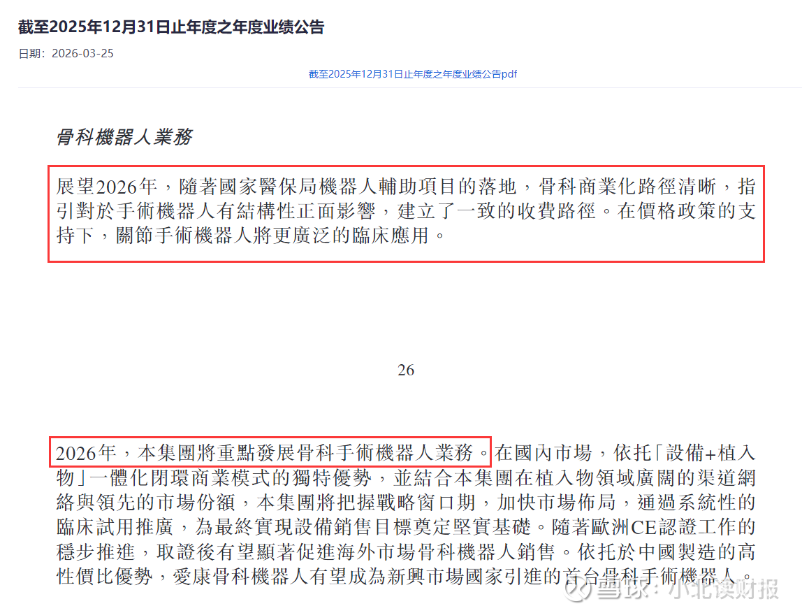 爱康医疗业绩公告里提到2026年公司将重点发展骨科手术机器人业务,最新的政策也在推动手术机器人商业化落地。
