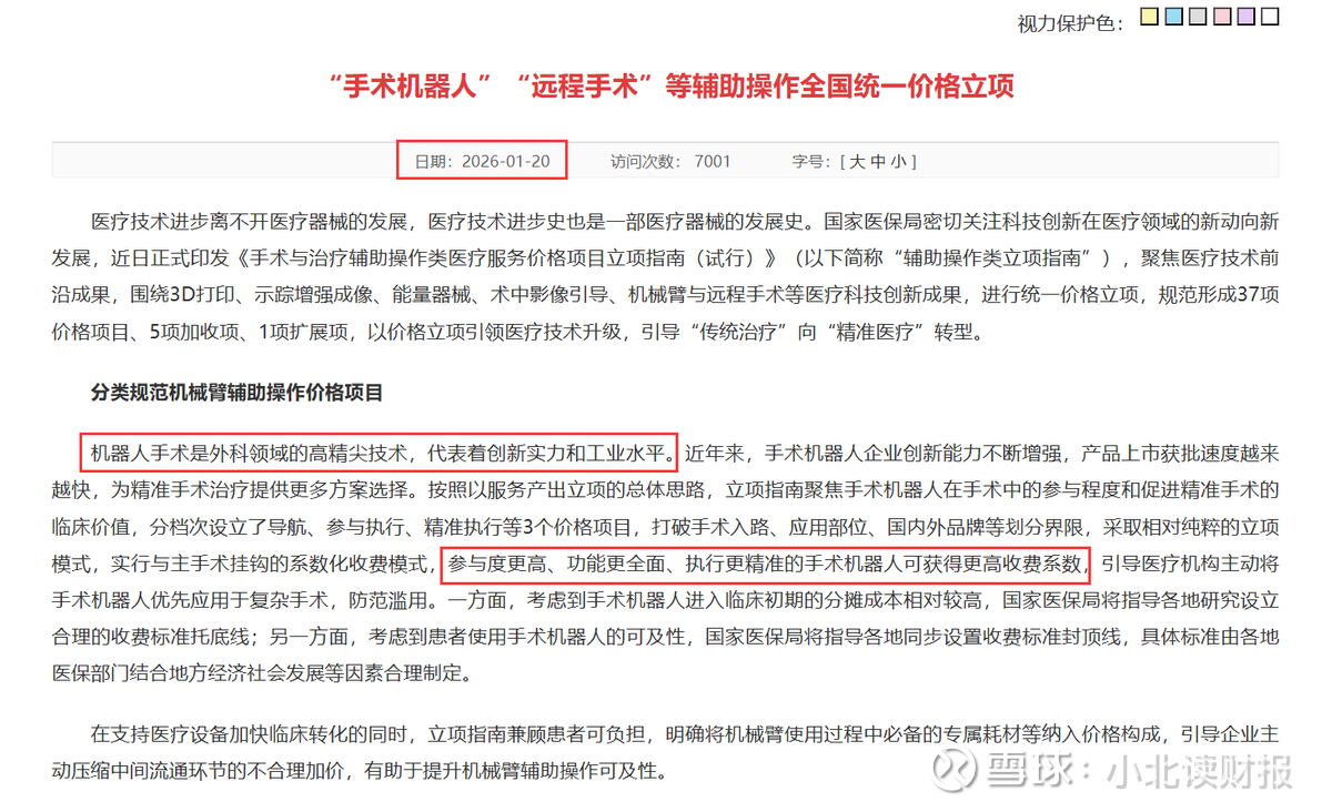 国家医保局在今年1月20日的文章中指出,机器人手术室外科领域的高精尖技术,代表着创新实力和工业水平,政策引导对参与度更高、功能更全面、执行更精准的手术机器人获得更高的收费系数。