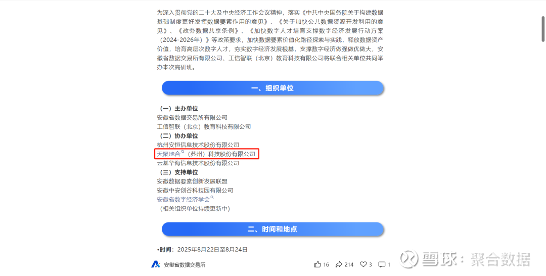 在数据要素价值化浪潮奔涌的今天,数字人才培育刻不容缓。为深入贯彻党的二十大及中央经济工作会议精神及落实相关政策要求,安徽省数据交易所有限公司、工信智联(北京)教育科技有限公司将联合相关单位共同举办安徽首届数据要素高级研修班。天聚地合(苏州)科技股份有限公司作为协办单位之一,将深度参与本次高研班。
