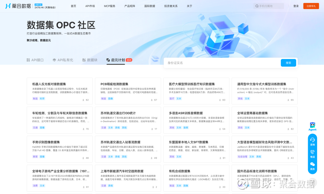 数据集线上OPC社区提供了涵盖金融财税、工业制造、医疗教育等多领域的 200+ 高质量AI数据集以及开放了 1000多个 标准API及数据集服务;同时聚焦数据获取中的“信息不对称”痛点,为每个数据集提供了详尽的数据介绍、深度详情说明、标准数据字典及真实数据样例,为OPC创业们构建起一个“即开即用”的高质量数据生态,随心挑选自己所需要的“数据燃料”。