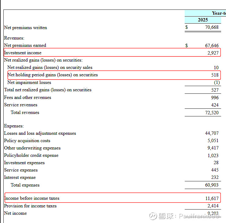 按照progressive公司1-10月业绩,简单按一下计算器:假设投资收益由目前的4.6%-5%降为1%的话,投资收益会从1-10月的29亿降为5-6亿,同时公司会确认大量的证券亏损。假设将表中5亿的证券出售收益清零,这样的话,税前利润会从116亿变成87亿,降低26%,net income 变为69亿,调整至1-12月即82.65亿,按照目前的市值市盈率变为16PE,有不错的安全边际,进入击球区$Progressive(PGR)$