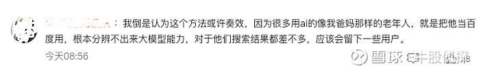 对普通用户而言,红包这种接地气的玩法,恰恰是最直接的引流方式。看到一个挺有意思的评论,可能代表了不少普通人的看法,他就认为元宝红包这个方法奏效,理由是很多用AI的都是老年人,其实是分辨不出来大模型能力,对于他们搜索结果都差不多,因此会留下一些用户。