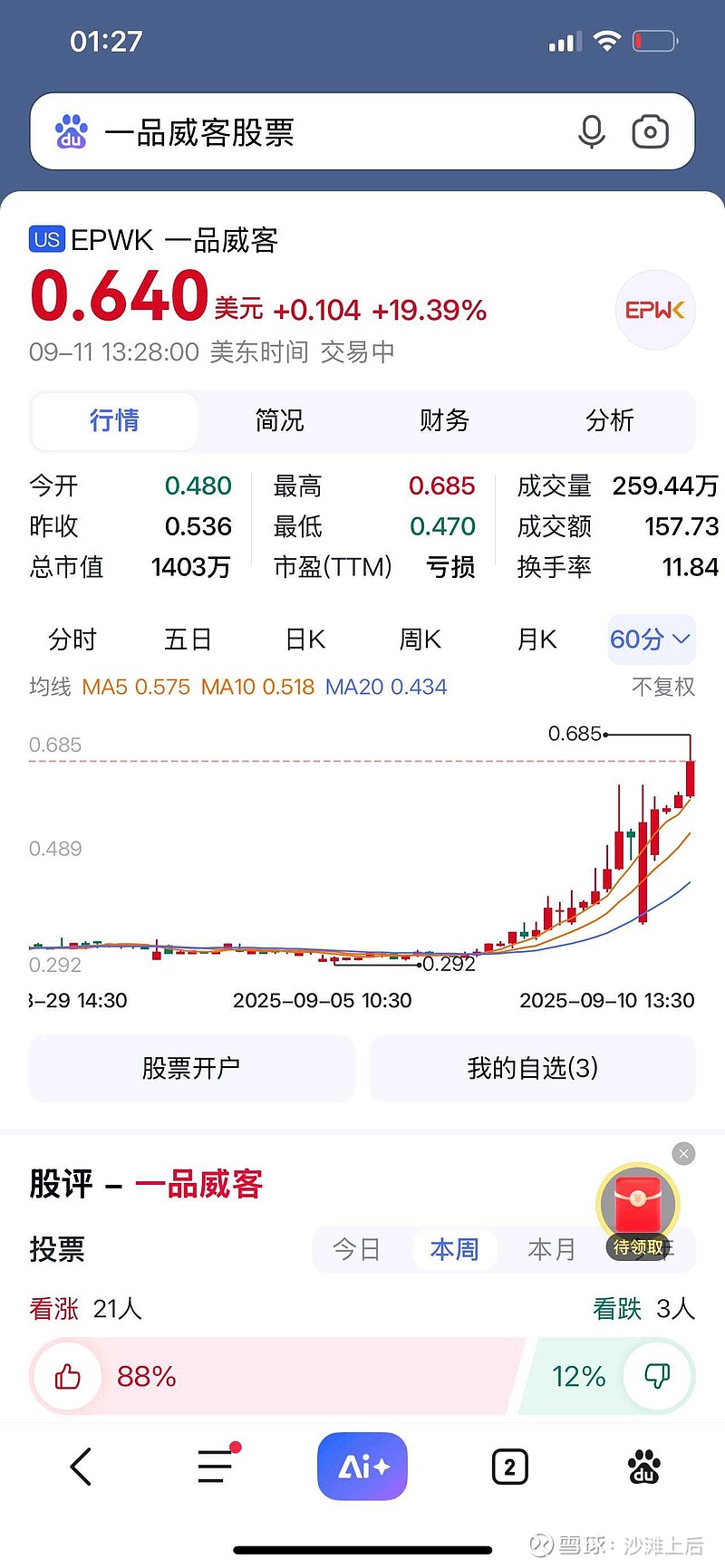 $一品威客(EPWK)$ 气势如虹,连涨三日。9月9日入手15万股,股价翻倍,三日浮盈45000美金。长期看好EPWK平台国际化业务布局的潜力,AI赋能全球创意设计行业,未来市值超20亿美金,值得期待。