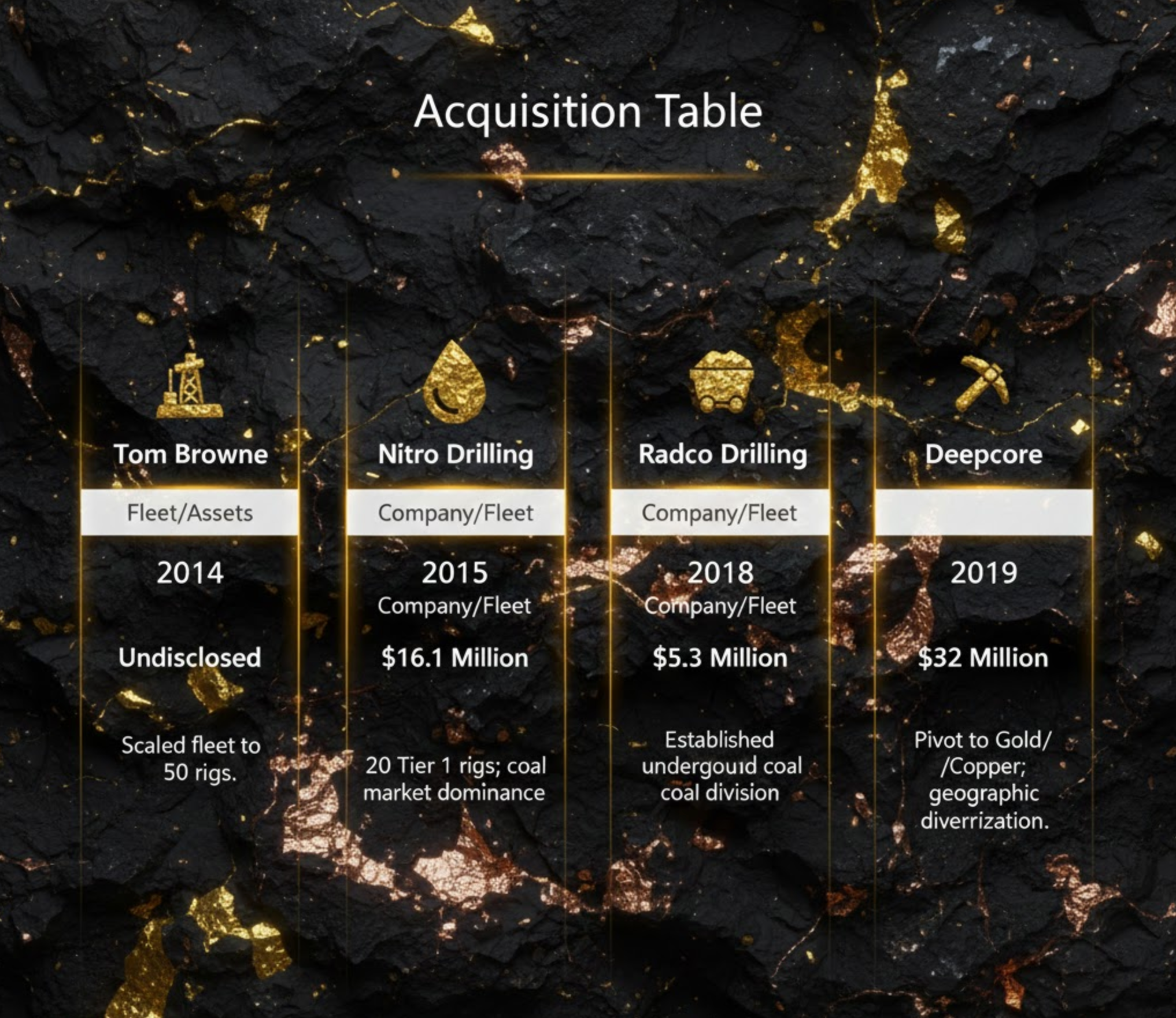 2014 年,MSV 收购了 Tom Browne Drilling Services 的资产,使其钻井船队规 模扩大到 50 台。随后在 2015 年,该公司以约合人⺠币 10000 元的价格收购了 Nitro Drilling公司,这笔交易具有里程碑意义。$\$16.1$百万。收购 Nitro 至关 重要,它为 MSV 提供了 20 台符合全球大型矿业公司严格要求的 Tier 1 钻机。 除了扩大船队规模外,Nitro 还带来了大直径钻井和环境监测方面的专业能力, 巩固了 MSV 在澳大利亚东部煤炭行业的统治地位。