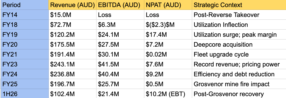 Mitchell Services Limited(ASX:MSV)的历史是澳大利亚矿业服务行业企业 转型的一个典型案例,它描绘了一家规模不大的家族企业发展成为全球钻井行业 中占据主导地位的多元化力量的轨迹。该公司秉持着“淘金热时期,卖铲子”的理 念,将自身战略定位为关键基础设施提供商,其命运不仅与大宗商品价格挂钩, 还与全球大型矿业公司的基本资本支出周期息息相关。截至 2026 年初,该组织 已进入其发展的关键第三阶段,其特点是从激进的债务融资的非有机增⻓模式过 渡到高收益、现金流生成模式,该模式由强化的资产负债表和在脱碳领域的先锋 地位所支撑。