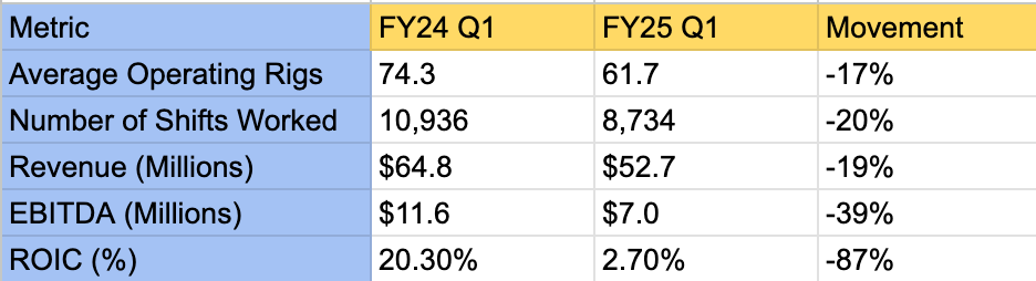 影响与缓解格罗夫纳油田关闭的直接后果是钻井平台利用率急剧下降。2025 财年第一季度,平均运营钻井平台数量降至 61 台,低于上年同期的 74 台。总工作班次减少了 20%(2202 个班次),公司录得季度临时会计亏损。$320,000。