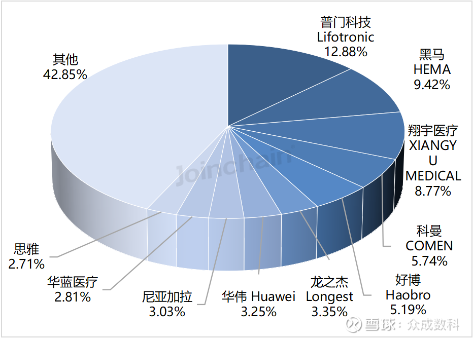 从各品牌主流型号来看,翔宇医疗前五型号市占率之和占该品牌市场总额的69.62%;普门科技前五型号市占率之和占该品牌市场总额的81.91%;医迈斯前五型号市占率之和占该品牌市场总额的100.00%;普施康前五型号市占率之和占该品牌市场总额的100.00%;慧康前五型号市占率之和占该品牌市场总额的100.00%。