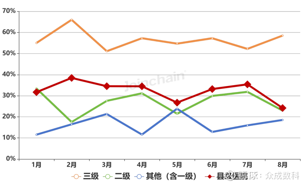 从采购单位类型上看,2025年8月三级医院、二级医院采购占比分别为58.5%、22.98%;县级医院采购占比为24.18%。各类型采购单位采购占比趋势变化如图表5所示。