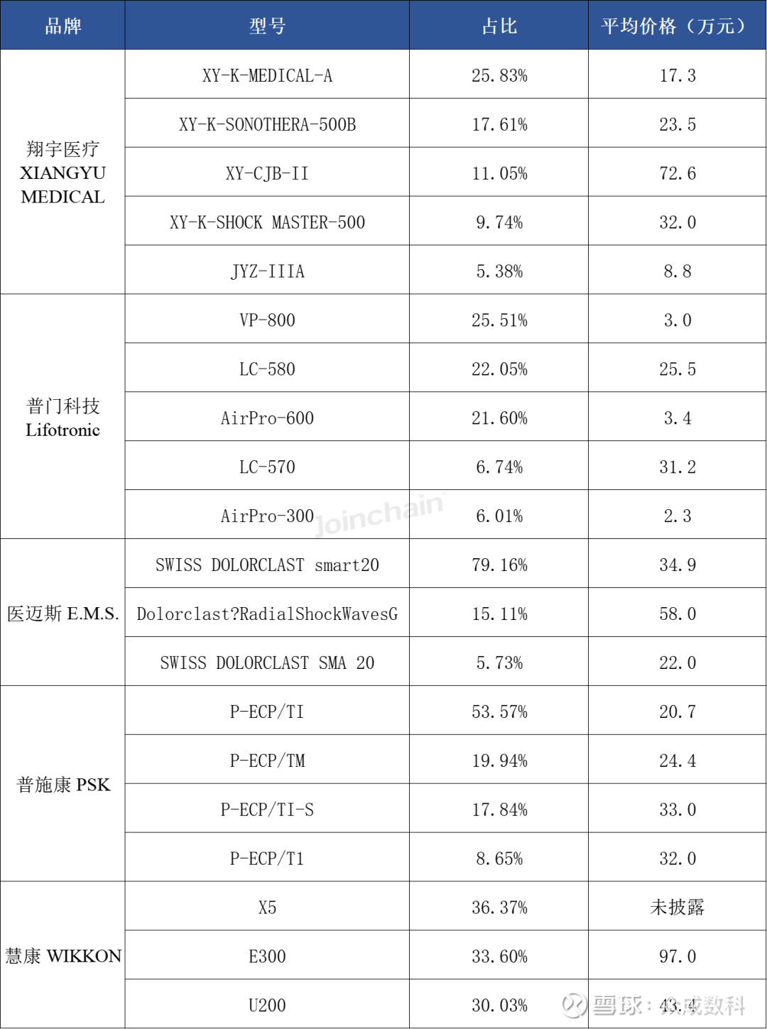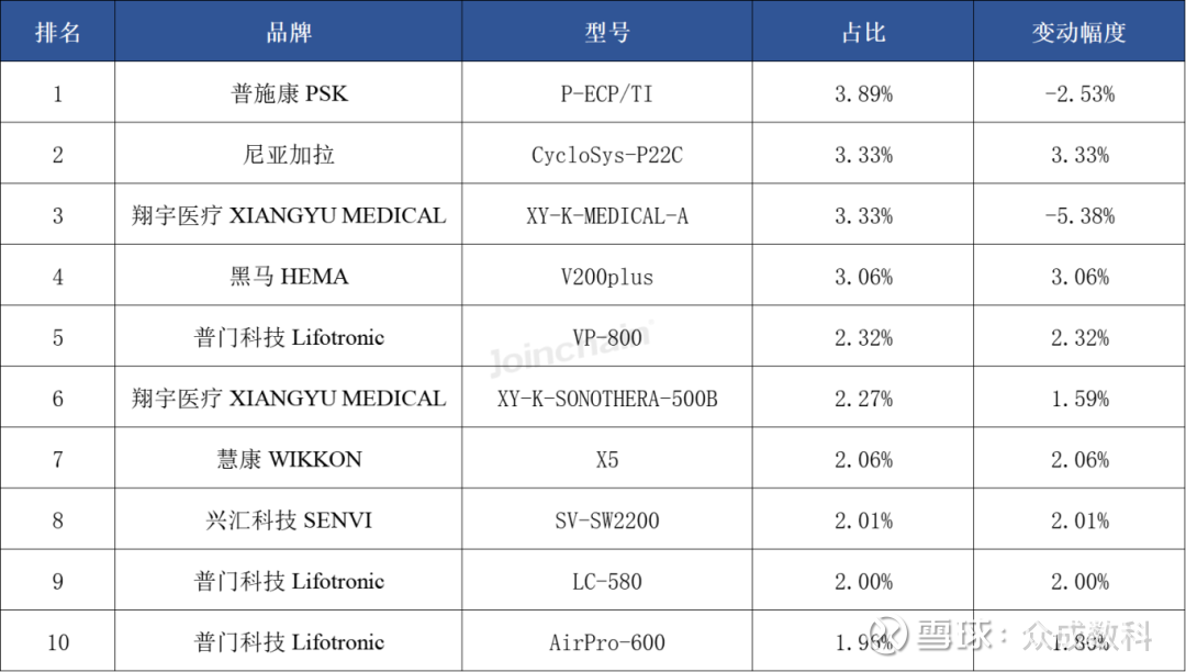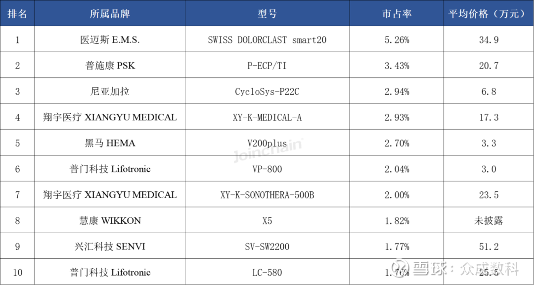 从具体型号上看,排名前三的型号分别来自医迈斯的SWISS DOLORCLAST smart20、普施康的P-ECP/TI和尼亚加拉的CycloSys-P22C。