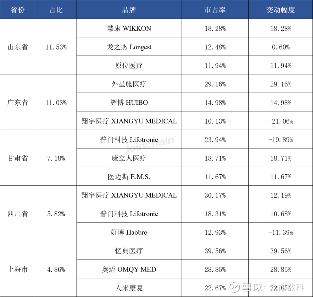 从各省份品牌来看,前五省份的品牌主要以翔宇医疗、普门科技为主。