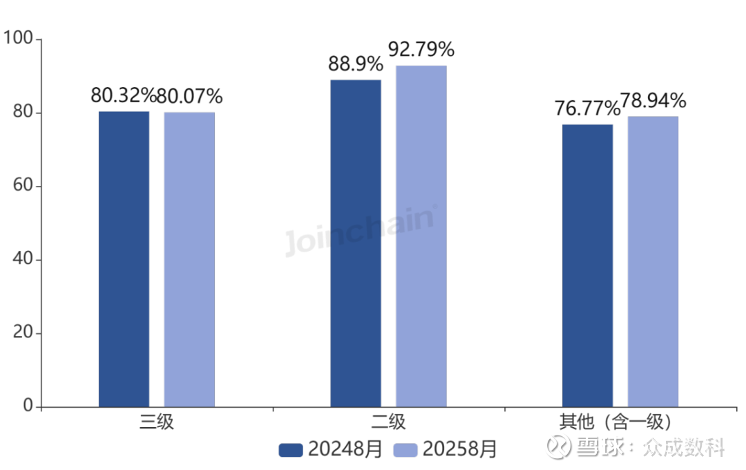 从医院品牌国产化率来看,2025年8月三级医院国产品牌占比为80.07%,较去年同期下降0.25%;二级医院国产品牌占比为92.79%,较去年同期上升3.89%。