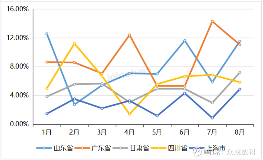 从区域分布看,2025年8月西部地区采购金额占比最高,为40.01%,其次是东部地区39.18%。省份方面,排名前五的省份有山东省、广东省、甘肃省、四川省、上海市。