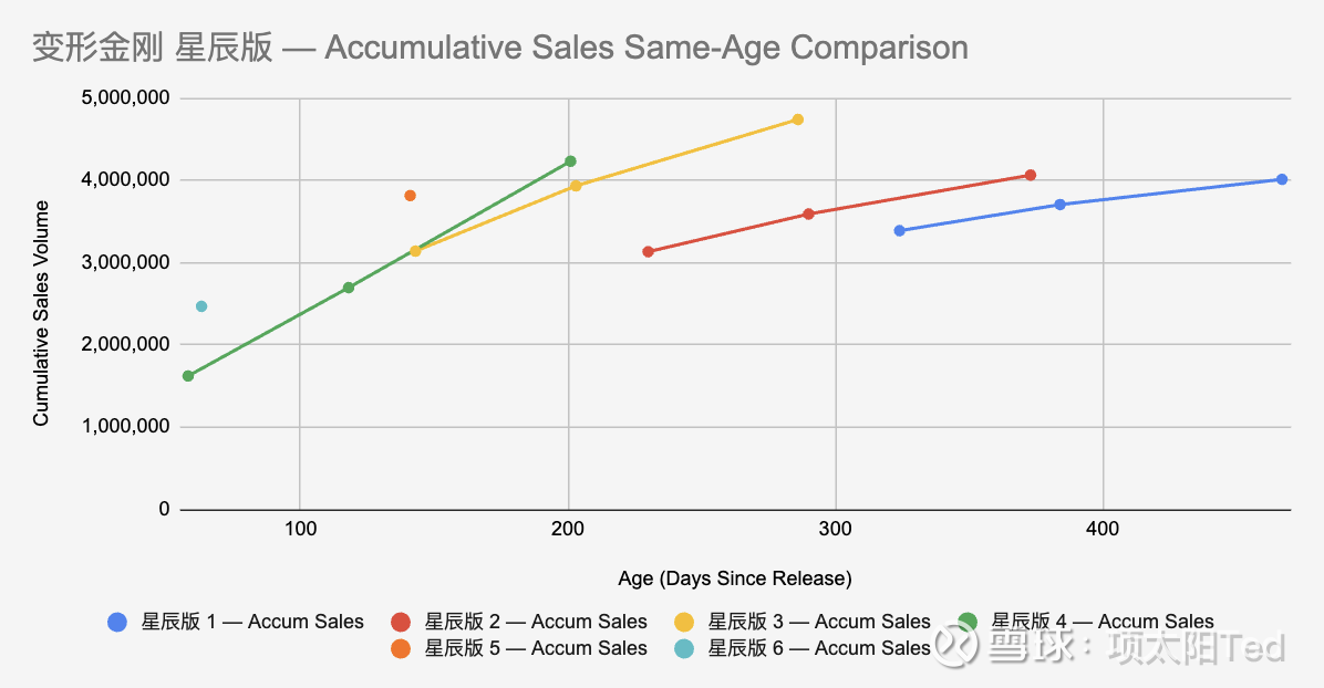 变形金刚星辰版趋势暴涨:每一弹新品动销显著强于前一弹;新品大概仅用 100 天追上老品 400 天的销量。
