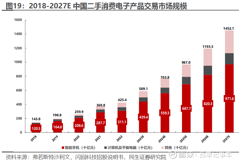 根据闪回科技的招股说明书,2018-2022 年中国二手消费电子产品市场规模(包括回收、终端销售、B2B 流转、二手商品卖家与终端买家直接交易的全部形式在内的所有流转环节的加总交易金额)从1438 亿元增至4254 亿元,年复合增速达31.1%;其中,手机占据了大部分市场份额,2022 年的占比约为73%,2018-2022 年CAGR 为26.8%,2022-2027 年的年复合增速预计为25.6%。弗诺斯特沙利文预计2027 年中国二手消费电子市场规模有望达14,521 亿元,未来5 年CAGR 延续强劲,为27.9%。
