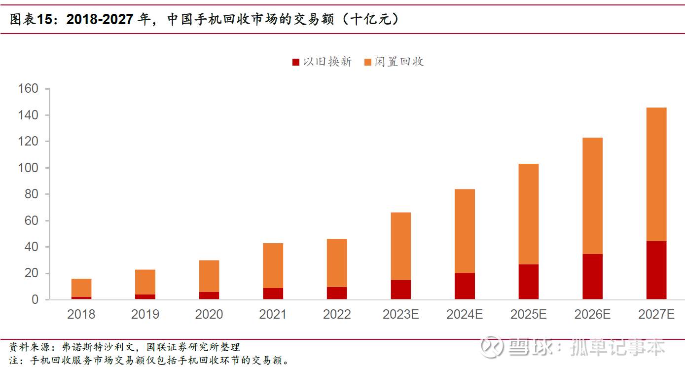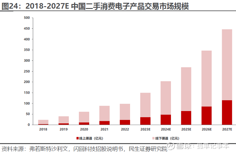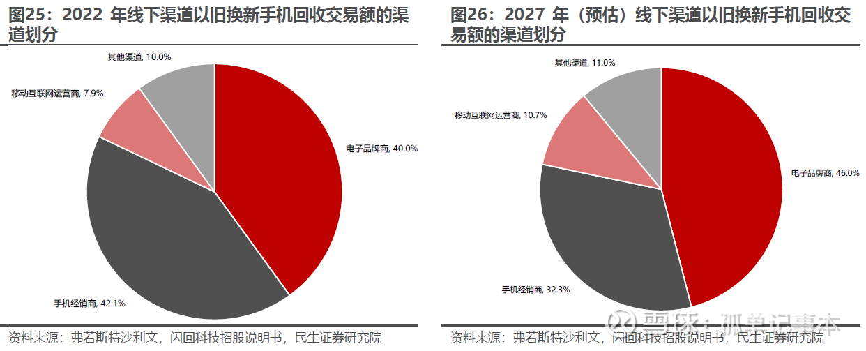 根据闪回科技的招股说明书, 2018-2022 年中国以旧换新手机回收交易额从23 亿元增至98 亿元,年复合增速达43.7%,尽管线下渠道是主要形式,2022 年的占比约为76%。2018-2022 年线上渠道的CAGR 为56.5%,超过线下渠道的40.5%的年复合增速;2022-2027 年的年复合增速预计为36.8%,超过线下渠道的34.9%CAGR。