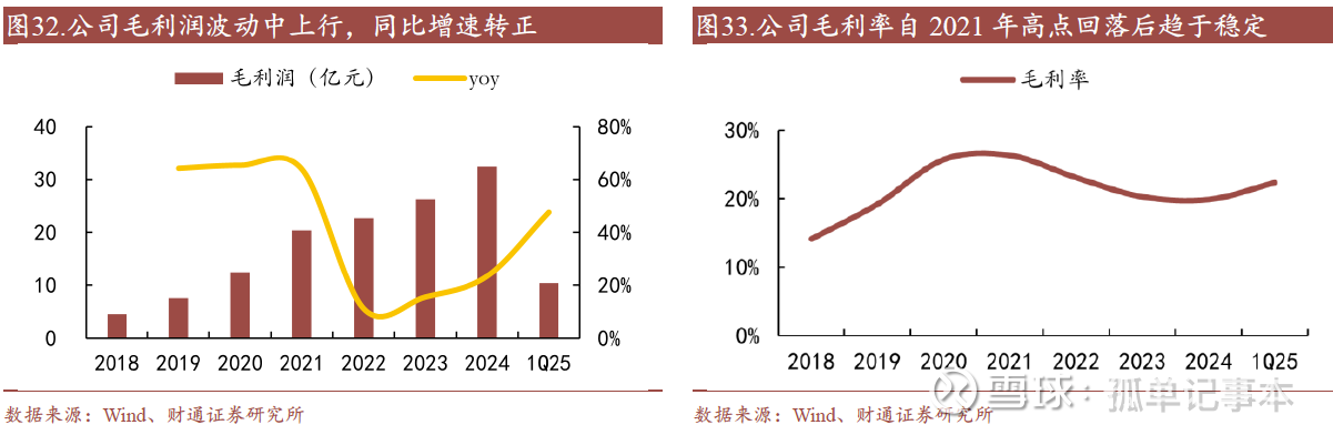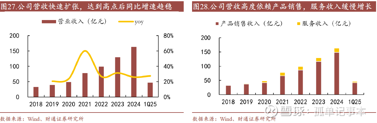 公司营业收入由2018年的32.62 亿元迅速增加至2024 年的163.28 亿元,复合增长率为29.7%,保持高速增长态势。1Q2025 公司延续高景气表现,实现营业收入46.53 亿元,同比增幅达27.44%,收入端延续高质量增长态势。从业务结构看,产品销售仍是公司收入的主要来源,在整体营收中占比超过85%。公司服务收入由2018 年的0.12 亿元跃升至2024 年的14.84 亿元,营收结构中的占比由0.36%大幅提升至10%左右。