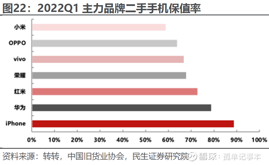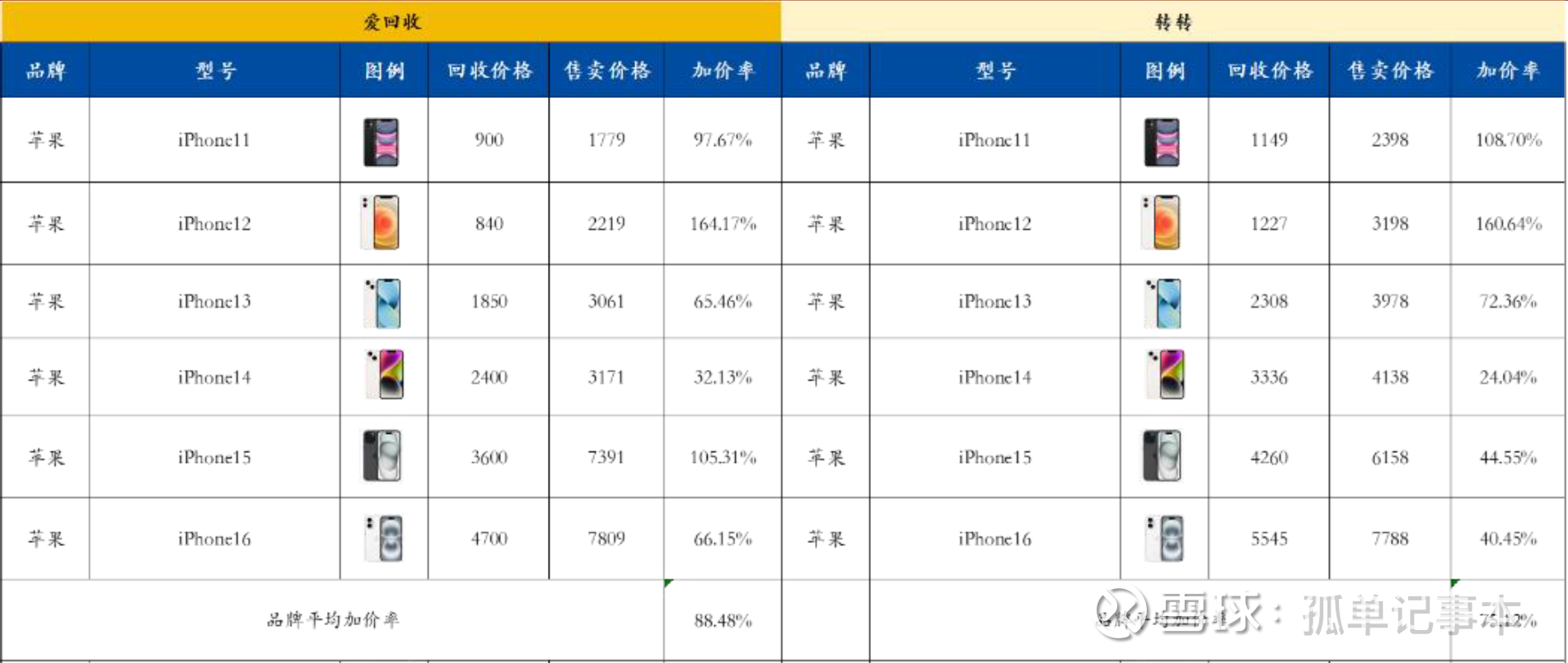(6)加价率更高:相比于华强北和夫妻店,公司解决了交易和售后的信任风险,解决了流动性风险,因而在回收端有更强的议价权;同时,在法律法规允许的情况下,公司对屏幕和电池进行合规翻新,赚取产业链附加值,部分自营手机经过翻新,实际使用体验与售后与新机差别不大,因而产品竞争力很强。爱回收整体加价率较高,其中,苹果产品的溢价能力尤其突出,优于竞争对手转转。