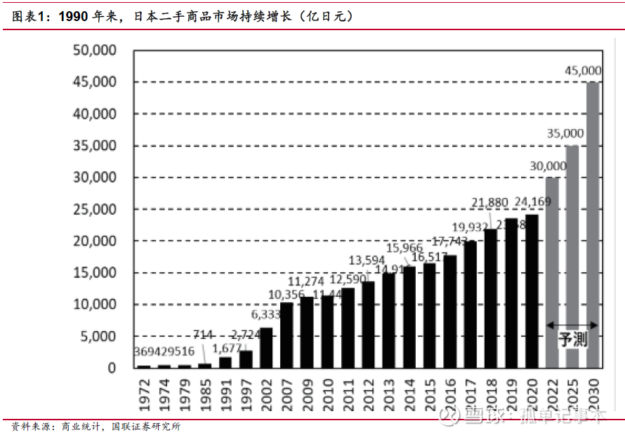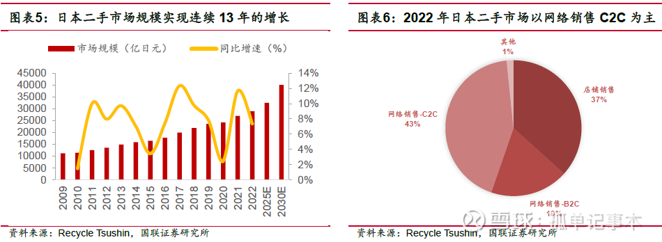 日本:1989 年到2004 年间,日本是世界上最大的奢侈品市场,其份额在1997 年-2002 年间达到峰值,平均为30.5%。而在上世纪90 年代初,日本经济进入停滞阶段,居民消费力下滑,并开始出售藏品,日本二手物品交易市场实现高速发展。这个时期,日本的中古奢侈品店的数量从1 千多家增长到了1 万多家。2022 年日本二手市场规模预计为2.9 万亿日元,同比增长7.4%,实现自2009 年以来连续13年的增长。由于日本具有完备的商品保障措施,二手市场以网络销售为主。