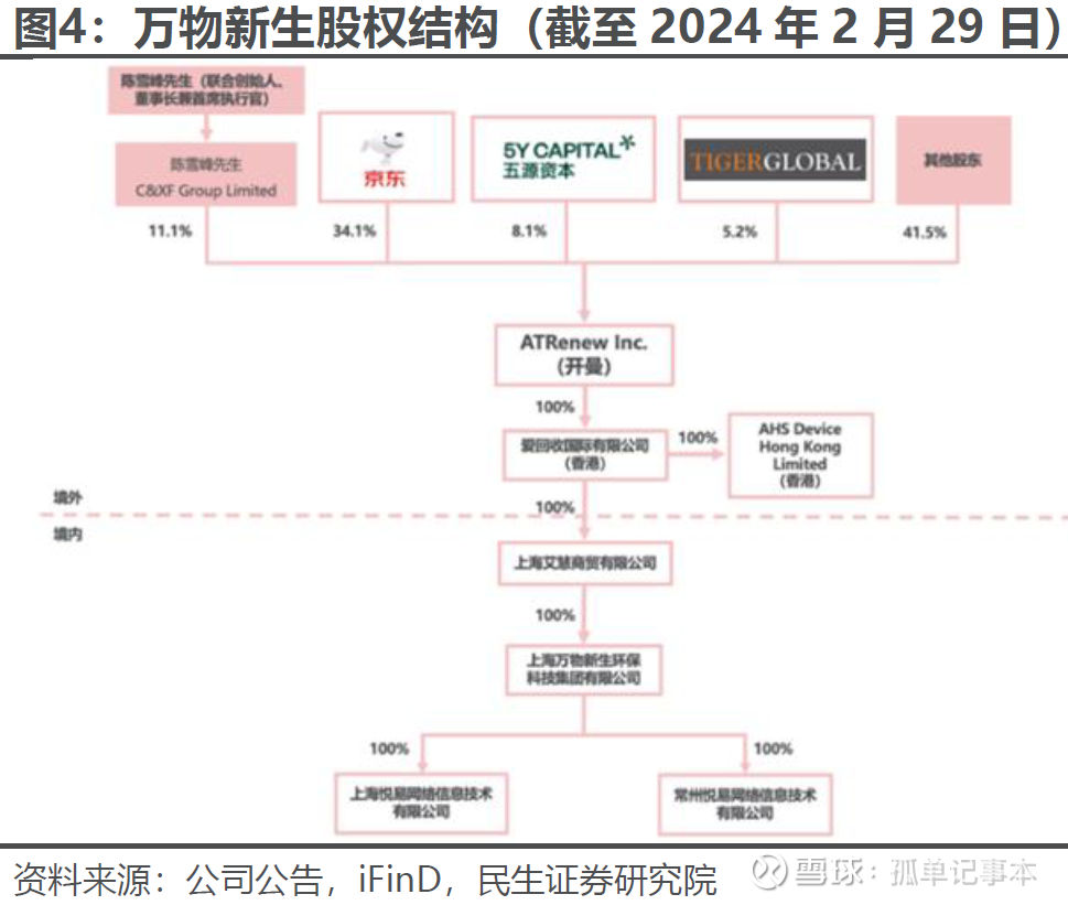 京东集团合计持有公司34.02%的股份,创始人陈雪峰持有11.79%的股份,拥有43.2%的投票权。自2015 年起,京东参与了万物新生C-F 多轮融资,2021 年万物新生IPO 后京东持有万物新生所有的B 类普通股,对公司重要事务具有相当大的影响力。