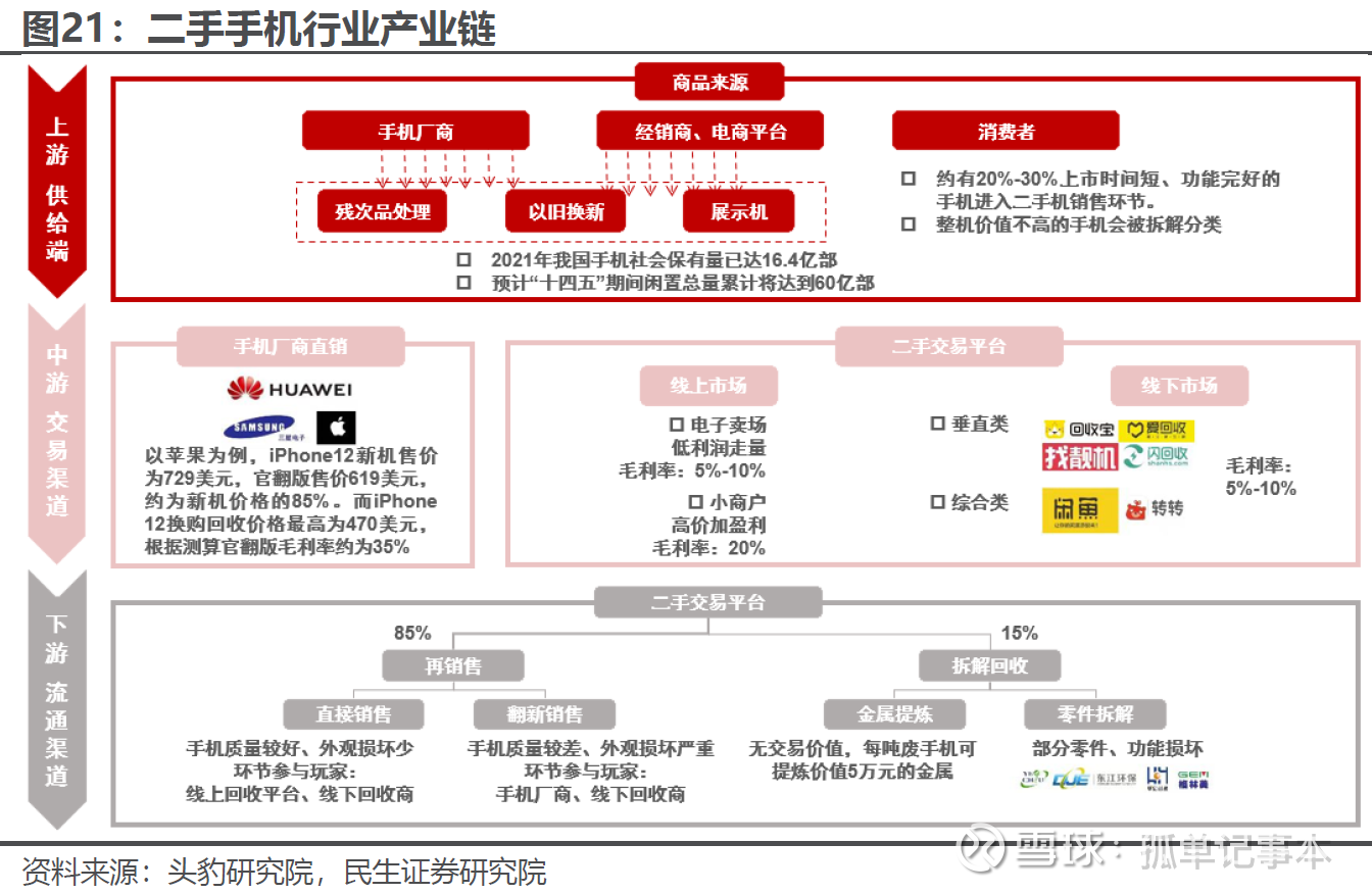 从供给端来看,参与主体为手机厂商、经销商、电商平台和个人卖家;通过手机厂商直销和二手交易平台两种渠道;最终通过再销售或拆解回收等形式实现资源的循环,其中成色较好的大多直接出售或从零售商出售给个人消费者,损坏较多的或卖给批发商进行翻新销售。从二手手机市场主力品牌手机平均保值率来看,iPhone 的保值率保持高位,国产安卓手机保值率有所提升。