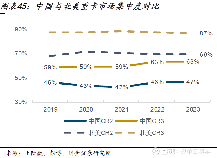 国内重卡CR2 和CR3 均远低于北美市场,近3 年提升明显,长期看还有大幅提升空间;其三伴随中国车企出海实现总量扩容。考虑到海外发达市场配套关系已经相对成熟,发展中市场普遍被欧美日韩车企或以康明斯为代表的三方企业通过合资与本土企业深度绑定而占据,潍柴后续重卡发动机出海空间更多来自于搭载在中国主机厂车型上出海。
