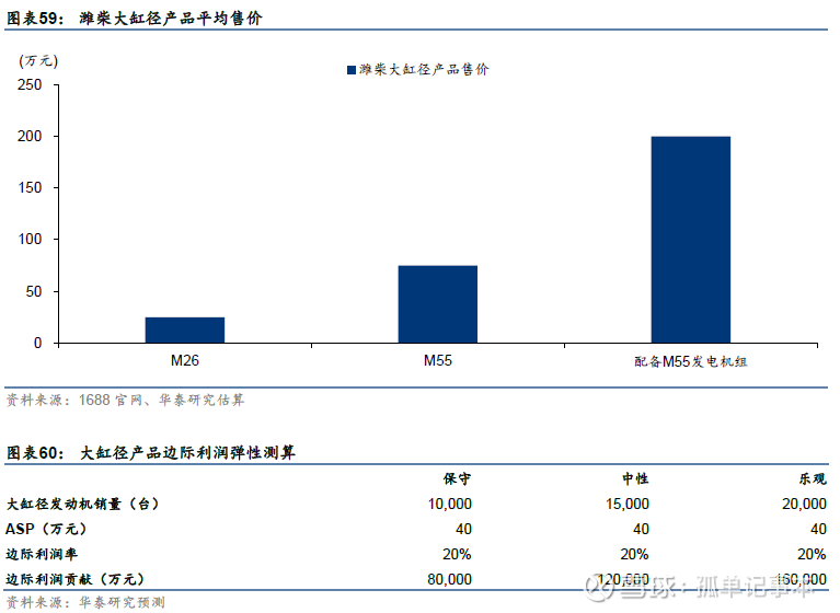 公司2018-2020 年大缸径发动机销量为0.18/0.28/0.34 万台,2023 年销量8100 余台,已占全球市场份额10%,交付的客户包括全球前十五大发电设备OEM 厂商,ASP 达40-50 万,最高达100-120 万元,当前公司逐步朝年销量1 万台的阶段性目标和年销量2 万台的中期目标迈进。我们预计,随着M55 等大排量产品推广,ASP 有望提升至40 万元左右,在净利润率20%的假设下,远期交付2万台大缸径发动机对应16 亿元的利润弹性。
