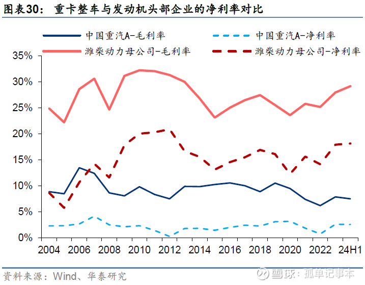 对比重卡整车,发动机业务价值量更高。发动机毛利率中枢在20-30%、净利率中枢在10-20%,重卡整车毛利率中枢在5-10%、净利率中枢在0-5%,发动机环节盈利能力更优,为重卡产业链的利润中心。