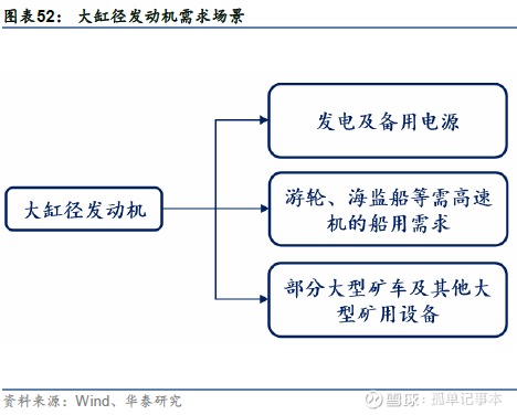 大缸径发动机指500kW 以上到1 万kW 的发动机,广泛应用于备用电源、船舶动力、矿用动力、岛屿国家发电等领域。大缸径发电用发动机为卡特彼勒、MTU、康明斯、三菱等海外巨头垄断。大缸径船用发动机的市场主导者则为瓦锡兰、曼恩、卡特比勒等。目前大缸径发动机全球市场容量约为8 万台/年,市场规模约为200亿美元,对应ASP 为25 万美元。