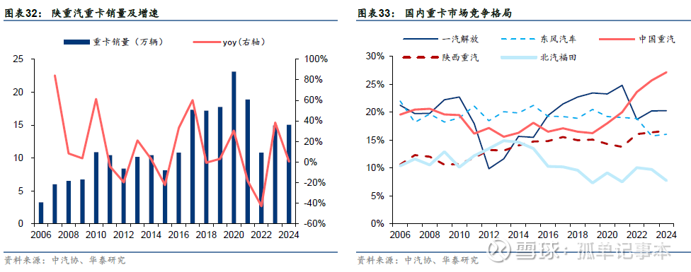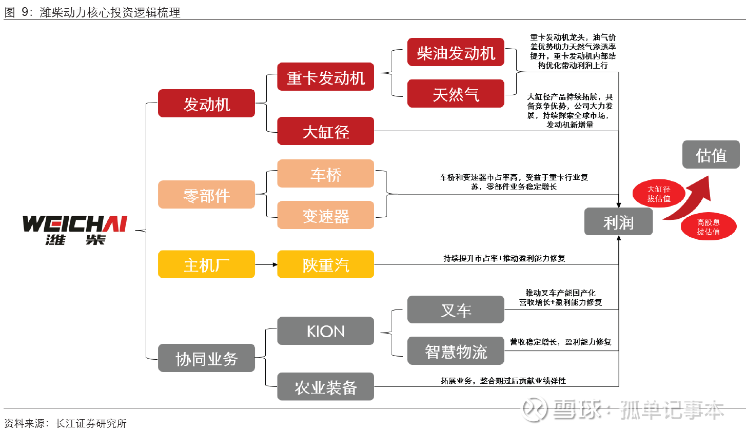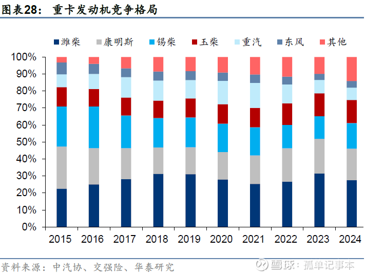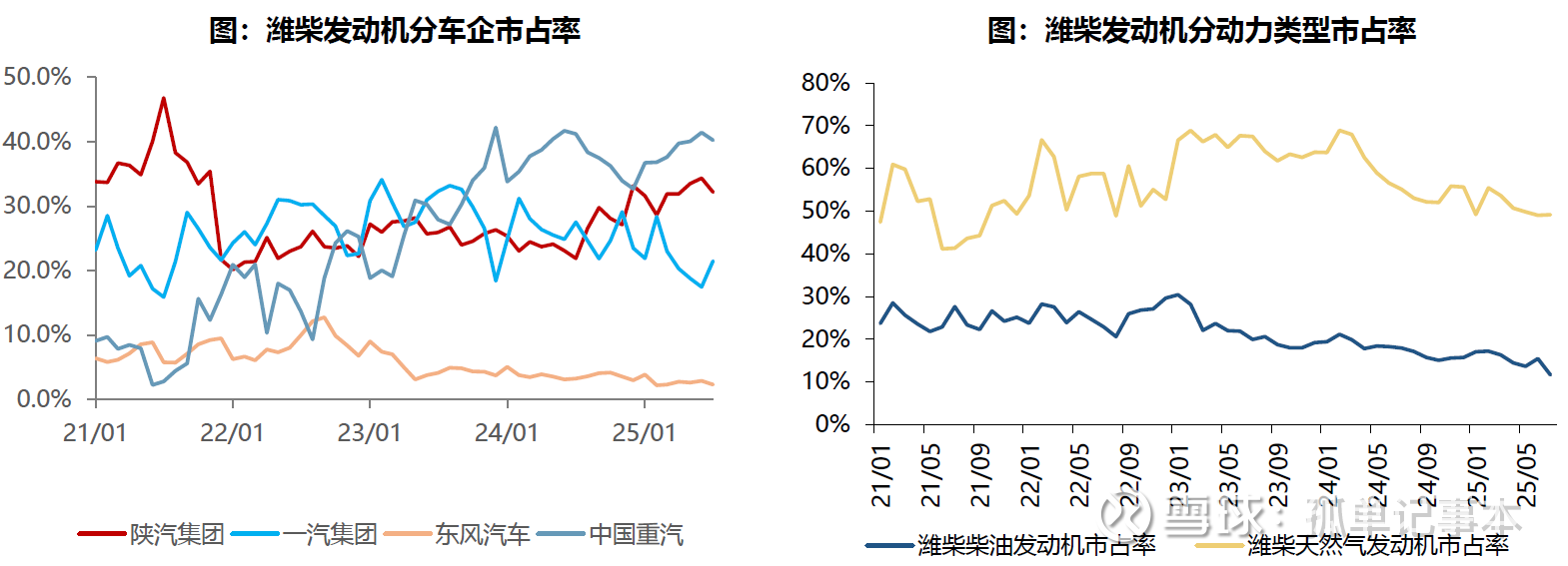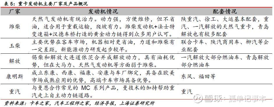 重卡发动机与下游联动较多,潍柴的柴油发动机主要适配给陕汽和重汽,天然气发动机具有统治力,会配套给一汽。