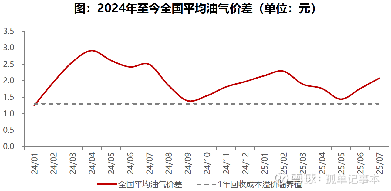 由于电动重卡渗透率提升,导致潍柴承压(天然气发动机销量减少),但油气价差环比扩大,经济性依然良好。7月全国平均油气价差2.1元,环比6月+0.3元,高于1年回收成本溢价临界值(1.3元)。