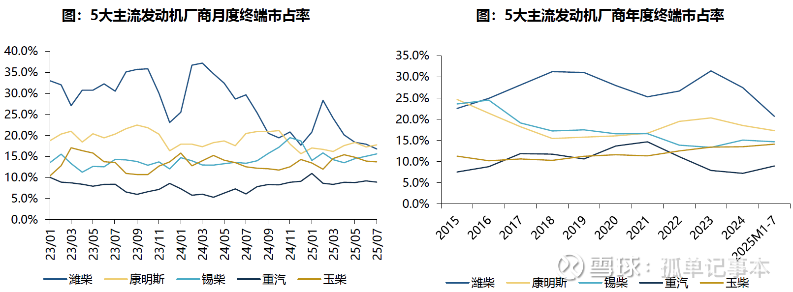 终端口径下, 7 月潍柴/ 康明斯/ 锡柴/ 重汽/ 玉柴市占率分别16.8%/17.8%/15.6%/8.9%/13.7%,较24年全年分别-10.7/-0.8/-0.5/+1.7/+0.2pct,环比6月分别-1.1/+0.5/+0.5/-0.3/-0.2pct。