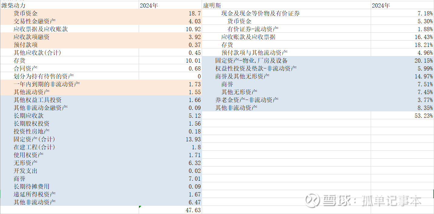 比较潍柴与康明斯的ROE细分项,除了净利润率较低外,资产周转率也偏低,这与潍柴动力的资产结构有关。查阅2024年年报,相比康明斯,潍柴动力的流动资产占比更高,53%vs47%,并且潍柴动力流动资产中货币资金+交易型金融资产占比达22.7%(885亿),康明斯货币资金只有7%。除此外,潍柴还通过融资租赁的方式开发业务(一年内到期的非流动资产)来增强业务竞争力。后续如果提高资金使用效率,总资产周转率仍有提升空间。