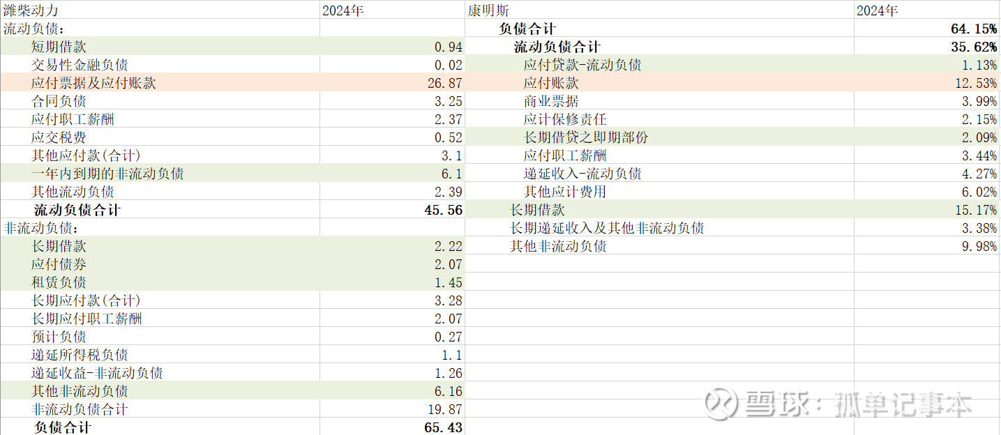 负债端,潍柴动力和康明斯的负债合计占资产负债表基本在65%左右,潍柴的流动负债占比更高,46%vs36%。有息负债角度,两者差不多,在19%左右。但潍柴动力的应付债占比更高,表明公司相对供应商具有更强的话语权。