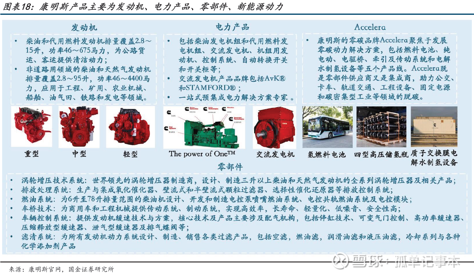 康明斯是一家全球领先的动力解决方案提供商,公司产品囊括柴油及天然气发动机、发电机组、交流发电机、排放处理系统、涡轮增压系统、燃油系统、控制系统、变速箱、制动技术、车桥技术、滤清系统,以及氢能制造、存储及燃料电池等,广泛应用于商用卡车、客车、建筑设备、农业机械、发电设备、船舶和铁路等多个行业。