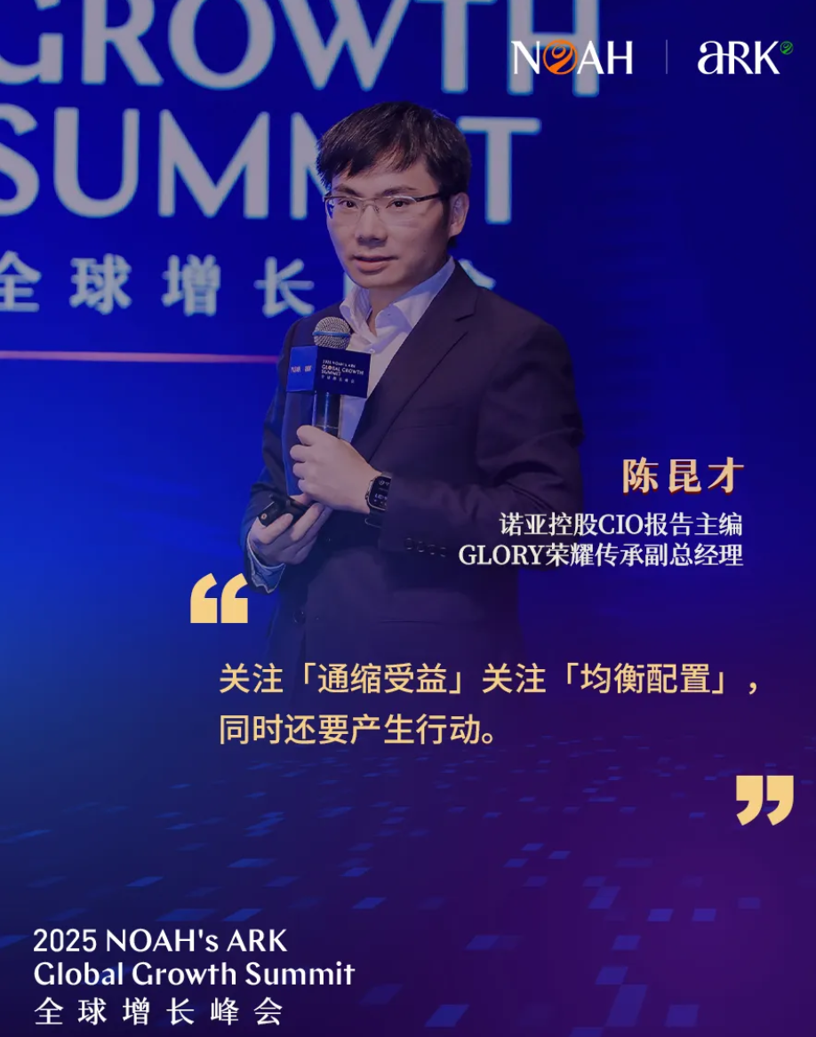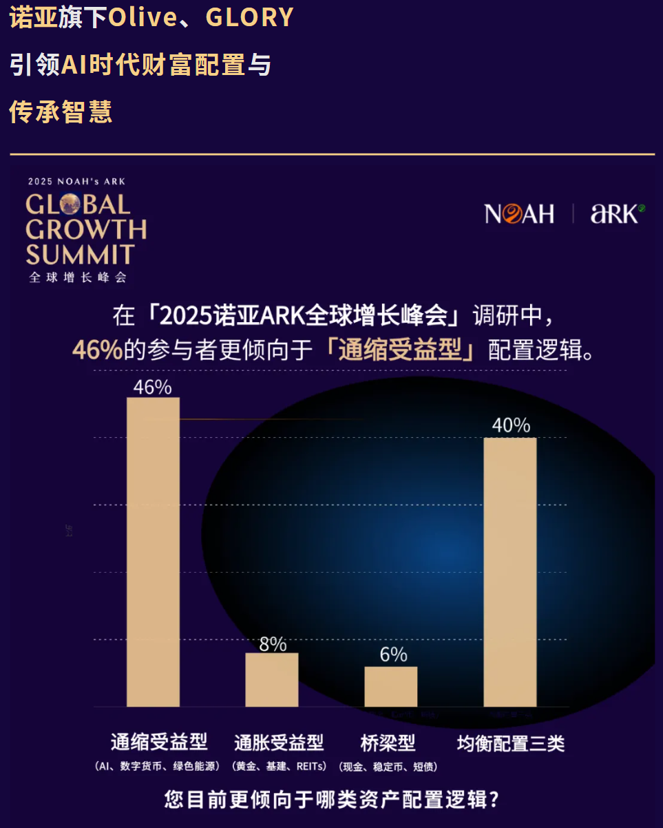 诺亚控股CIO报告主编、GLORY荣耀传承副总经理陈昆才进一步解析最新CIO报告,帮助客户理解并应用报告内容,应对当前经济环境的变化。陈昆才在演讲开始前进行了现场调研,结果显示,「通缩受益型」资产配置逻辑,正成为华人财富管理者关注焦点。46%的参与者更倾向于「通缩受益型」配置逻辑。该逻辑由《诺亚ARK 2025下半年CIO办公室报告》提出,配置类别涵盖AI、数字货币、绿色能源等关键领域。