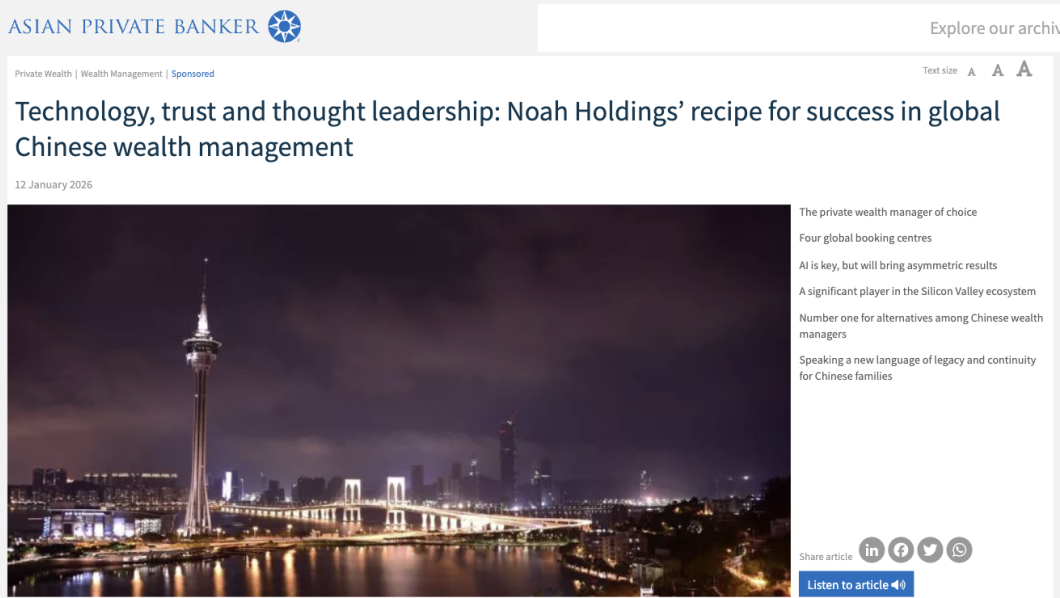 恰在此时,APB以《技术、信任与思想领导力:诺亚控股全球华人财富管理的成功之道》(Technology, trust and thought leadership: Noah Holdings’ recipe for success in global Chinese wealth management)为题,对诺亚控股进行专题深度报道。