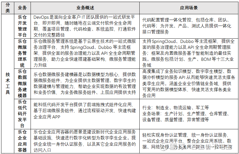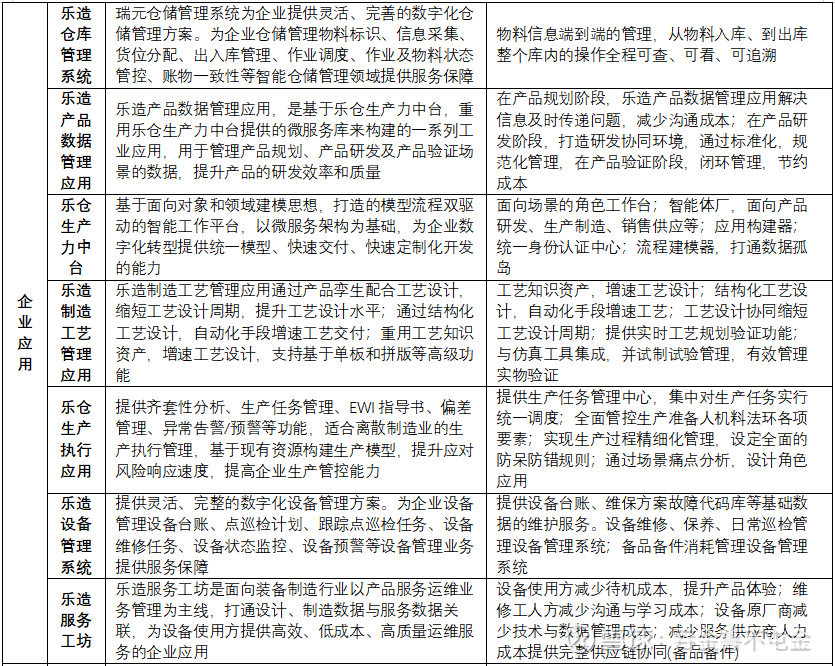 公司云产品与服务业务主要为客户提供公司自主研发的乐仓、乐研、乐造、乐数等“乐系列”工业软件产品和服务。乐仓是以用户为中心、模型流程双驱动的应用创造底座平台,提供从企业架构搭建、业务流程梳理、数据建模、低代码开发等全维度的企业级应用构建能力。乐研是支撑研发全链打通、驱动基于模型的正向设计以及设计和制造深度融合的 PLM 系列应用,覆盖项目管理(PPM)、需求管理(RQM)、基于模型的协同设计(MBSE)、产品数据管理(PDM)、数字化工艺管理(MPM)等解决方案套件。乐造是提供支撑制造运营的 MOM 系列应用,覆盖从制造执行(MES)、高级计划排程(APS)、质量管理(QMS)、仓储管理(WMS)、生产设备管理(EAM)等解决方案套件,兼具低代码开发与行业预配置套件,可快速适配不同行业、不同制造模式的运营管理需求。乐数是以工业大数据与 AI 人工智能技术为核心,提供从数据采集、治理、管理到智能分析的全链路产品套件,为企业搭建覆盖全业务域的数据治理体系,打造企业数据中枢以及数据智能应用平台。报告期内,公司持续对“乐系列”产品的研发投入,丰富细分产品,提升产品功能和性能。
