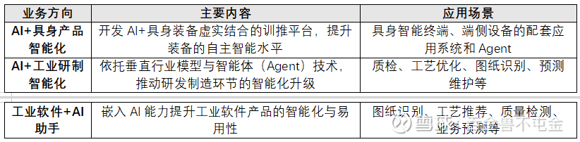 围绕“AI+工业”战略主线,公司自主研发“灵系列”AI agent产品及解决方案。目前已构建涵盖“AI+产品智能化”、“AI+业研制智能化”及“工业软件+AI助手”三大核心产品体系,开发出包含图纸识别、工艺推荐、质量检测、业务预测等多款垂域模型、覆盖二十余个工业场景的应用Agent以及多款工业软件智能助手产品并实现应用落地。公司同步推进“乐系列”产品迭代,融合AI技术,着力提升工业软件智能化水平,同时聚焦高毛利产品线,优化产品结构。