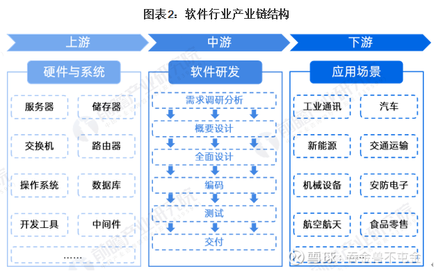 软件行业涉及环节较多,关系复杂,下游应用场景极多。简单来说,软件行业的中游主要为各类软件的研发具体过程包括了需求调研分析、概要设计、全面设计、编码、测试和交付等环节。产业链上游是软件研发所需的硬件与系统,下游是各类应用场景。